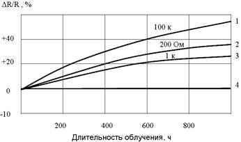 Рисунок 1 - Зависимость сопротивления тонкопленочных (1 - 3) и проволочных (4) резисторов от длительности гамма - облучения при общей дозе 2*109 Р.