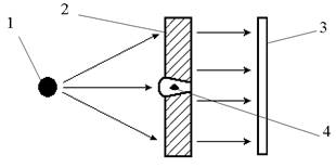 1 - источник; 2 - изделие; 3 - детектор; 4 – дефект