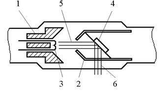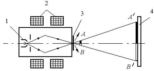 1 - катод; 2 - фокусирующие пластины; 3 - нить накала; 4 - анод;