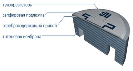 В настоящее время основная масса датчиков давления в нашей стране выпускаются на основе чувствительных элементов (рис. 2), принципом которых является измерение деформации тензорезисторов, сформированных в эпитаксиальной пленке кремния на подложке из сапфира (КНС), припаянной твердым припоем к титановой мембране.