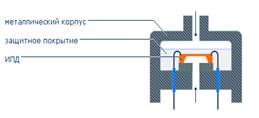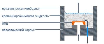 Для измерения агрессивных сред и большинства промышленных применений применяется преобразователь давления в герметичном металло-стеклянном корпусе, с разделительной диафрагмой из нержавеющей стали, передающей давление измеряемой среды на ИПД посредством кремнийорганической жидкости (рис. 5).