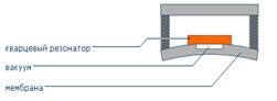 Частным примером может служить кварцевый резонатор (рис. 7). При прогибе мембраны, происходит деформация кристалла кварца, подключенного в электрическую схему и его поляризация. В результате изменения давления частота колебаний кристалла меняется. Подобрав параметры резонансного контура, изменяя емкость конденсатора или индуктивность катушки, можно добиться того, что сопротивление кварца падает до нуля – частоты колебаний электрического сигнала и кристалла совпадают – наступает резонанс.
