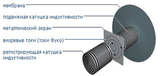 Индукционный способ основан на регистрации вихревых токов (токов Фуко). Чувствительный элемент состоит из двух катушек, изолированных между собой металлическим экраном (рис. 8). Преобразователь измеряет смещение мембраны при отсутствии механического контакта. В катушках генерируется электрический сигнал переменного тока таким образом, что заряд и разряд катушек происходит через одинаковые промежутки времени. При отклонении мембраны создается ток в фиксированной основной катушке, что приводит к изменению индуктивности системы. Смещение характеристик основной катушки дает возможность преобразовать давление в стандартизованный сигнал, по своим параметрам прямо пропорциональный приложенному давлению.
