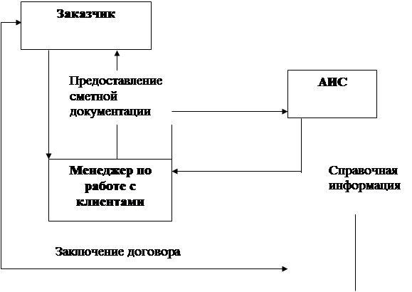 На основании представленной схемы и описания можно увидеть, что процесс обработки заявок значительно упрощается. Благодаря АИС необходимую информацию о стоимости работ на объекте клиент получает в течение нескольких минут. Так же мы видим, что на этом этапе работы предприятия пропадает необходимость в каких-либо действиях со стороны прораба. Объем информации, которой должен обладать менеджер по работе с клиентами значительно уменьшается, так как всю необходимую специальную информацию содержит АИС.