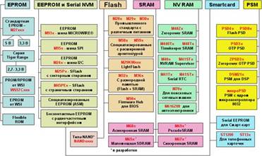 – EEPROM и SERIAL NVM (последовательная энергонезависимая долговременная память) – из последовательной перепрограммируемой энергонезависимой памяти выпускаются микросхемы памяти EEPROM с различным шинным интерфейсом, микросхемы последовательной Flash -памяти, стандартные микросхемы памяти специального назначения (ASM ) и бесконтактные (CONTACTLESS MEMORIES ) микросхемы памяти;