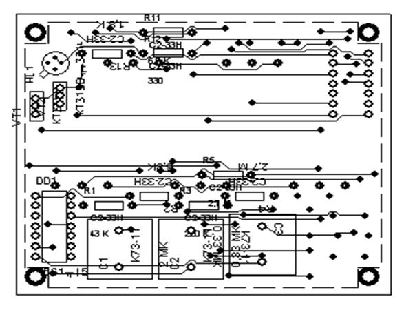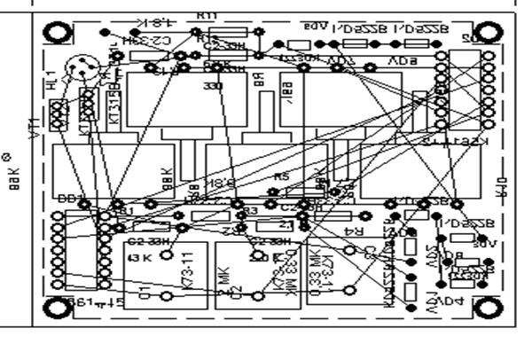 Для трассировки платы применим стандартный трассировщик QuickRoute. Но так как в нем нельзя задать необходимый шаг трассировки – 0.625мм, а лишь равный четырем значениям ( 25 mil, 20 mil, 16,7 -16,6 - 16,7 mil (для нерегулярной сетки) и 12,5 mil), то, применив шаг 25 mil (равно 0.635мм), оттрассируем плату в автоматическом режиме. Затем изменим шаг сетки на 0.625 мм и отредактируем положения переходных отверстий, проводников и надписей обозначений элементов.
