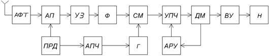 Структурная схема приемника с однократным преобразованием частоты: АФТ - антенно-фидерное устройство; ВЦ - входная цепь; СМ - смеситель; Г - гетеродин; ДМ - демодулятор; Н - нагрузка; АРУ - автоматическая регулировка усиления; АПЧГ - автоматическая подстройка частоты гетеродина; ПРД - передатчик.