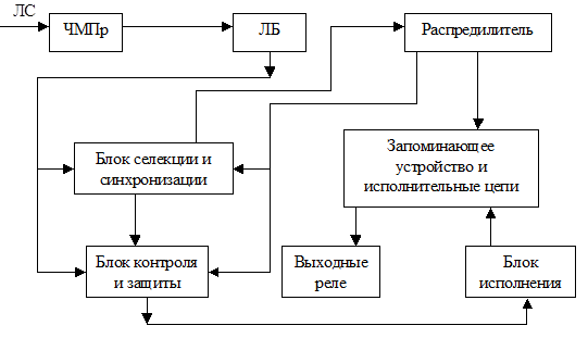 С приёмника ЧМПр тактовая серия поступает в ЛБ, затем на блок синхронизации и селекции, далее в распределитель. Одновременно тактовая серия поступает на блок контроля и защиты. Распределитель переключается в соответствии с тактовой серией. При холостых сериях осуществляется только контроль синхронизации и автоматическая синхронизация распределителей при сбоях. При передаче командной серии избирающие импульсы поступают с распределителя в запоминающее устройство. Считывание информации осуществляется импульсами, получаемыми из блока исполнения в конце цикла из двух кодовых серий, после проверки правильности принятых кодовых комбинаций. Импульсы запоминающего устройства выдаются непосредственно на выходные реле телеуправления.