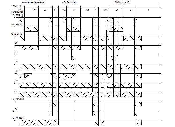 При сбое, когда приемный распределитель RG (А4) начинает опережать передающий распределитель (см. сбой- случай-1), триггер задержки ТЗД(А7) возбуждается раньше прихода сверхдлинного импульса и при первой же паузе сигнал 1 на входе Q-ЛТ(А1) после возбуждения ТЗД входные и выходные сигналы логической схемы И (Д1) будут иметь значение 1 , а затем при появлении очередного импульса на входе формирующей схемы Ф(Д2) появится сигнал 0, что приведет к срабатывания этой схемы и в конечном итоге к возбуждению триггера запрета ТЗП.
