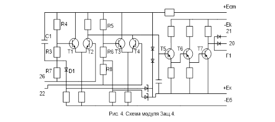 Модуль Защ. 4. содержит схемы защиты от одновременного возбуждения двух (или более) реле выбора объекта и двух (или более) реле выбора группы. Схема защиты содержит пороговое устройство, выполненное на двух транзисторах 77, Т2 (ТЗ, Т4). Уставка его задается делителем напряжения R3, R4 (R5, R6). Срабатывание устройства происходит в случае, когда падение напряжения на резисторе R7 (R8), вызыванное током, поступающим из внешней цепи, превысит уставку. Коллекторы транзисторов Т2 и Т4 обоих пороговых устройств объединены (транзисторы включены по схеме ИЛИ) и подключены к входу усилителя на транзисторах Т5—Т7. При срабатывании хотя бы одного порогового устройства (т. е. открывается транзистор Т2 или Т4) на вход усилителя поступает отрицательный потенциал, приводящий к отпиранию транзисторов Т5—Т7 усилителя. На выходе усилителя появляется положительный (нулевой) потенциал, приводящий к срабатыванию триггеров запрета ТЗП1 и ТЗП2 по коллекторным цепям (Г1 и Г4).