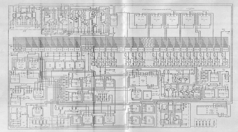 На З0-й позиции распределителя готовятся к переключению триггеры ТЗД и ТПП. При переключении распределителя в 31-ю позицию триггер ТЗД возбуждается, а ТПП — сбрасывается в состояние 0 через свой счетный вход (возбуждение триггера ТПП произошло на первой серии). При сбросе триггера ТПП с его выхода Г8 на диодную схему ДС2 подается отрицательный потенциал. С выхода Г7 триггера ТЗД после его сброса импульсом с реле времени РВк14 на диодную схему ДС2 подается отрицательный потенциал. После этого на все диоды схемы ДС2 подаются отрицательные потенциалы, инвертор 15(Г1) открывается, реле исполнения РИ возбуждается и становится на самоблокировку, так как инвертор 13(Г1) открыт и нулевой потенциал с его выхода Г1 через замкнувшийся контакт реле РИ поступает на его обмотку. На вход инвертора 13(П) потенциал — Ек поступает с выхода Г6 усилителя УСб.