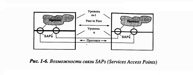 Еще несколько замечаний относительно модели ISO/OSI. Различают два направления коммуникации [рис.1-6]. Коммуникация между некоторым уровнем п и уровнем выше (n +1) осуществляется посредством интерфейса, построенного на основе спецификаций служб. Верхний уровень является «пользователем служб» (SU, ServiceUser), а нижний - их «поставщиком» (SP, ServiceProvider). Обмен информацией между уровнями осуществляется в точках доступа к службе (ServiceAccessPoints, SAP), причем элемент более высокого уровня может обращаться к элементу более низкого уровня. Это важно, если, например, нужно соединить уровни с помощью другого пути, что достигается выбором специальных SAP.
