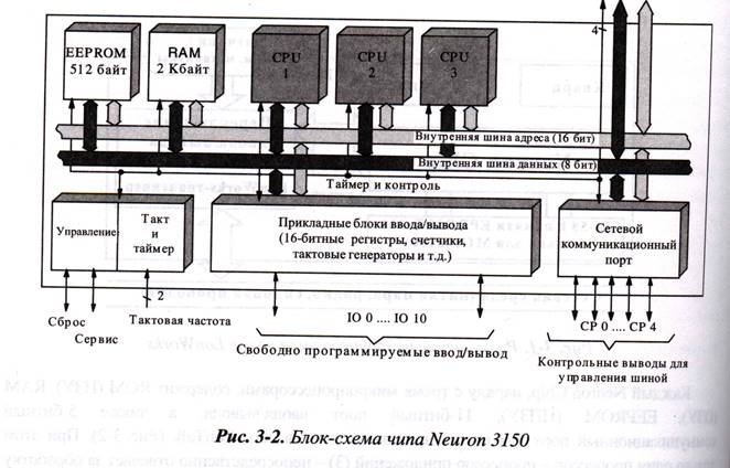 Микроконтроллер NEURON Chip содержит три 8-разрядных процессора, объединенных внутренней шиной со встроенными блоками общей оперативной и энергонезависимой памяти, а также периферийными устройствами (сетевым коммуникационным портом, таймерами, управляющими регистрами, портами ввода/вывода). Модель NEURON MC143120 также предусматривает использование и внешней памяти хранения программ. Несмотря на архитектурную симметричность внутренних процессоров, функциональное назначение каждого из них строго детерминировано. Два из них управляют сетевой передачей данных на основе многоуровнего сетевого протокола, а один предназначен для обслуживания прикладной части программного обеспечения узла. Синхронизация работы процессоров осуществляется за счет использования общих областей памяти данных. Уникальность адреса каждого из микроконтроллеров стандарта LONWORKS может быть обеспечено благодаря наличию собственного 48-разрядного идентификационного кода, записываемого в энергонезависимую память при их производстве.