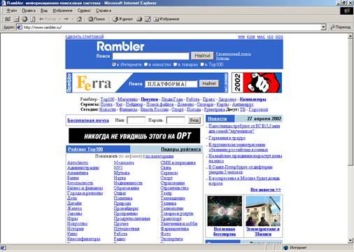 Рамблер - единственный в российском Интернете портал, объединивший поисковую систему, рейтинг-классификатор, а также ряд бесплатных сервисов и информационных проектов. Ресурсы портала регистрируют ежесуточно более 3,5 млн. посещений, а ежемесячная аудитория Рамблера составляет 60-70% всех пользователей Рунета.