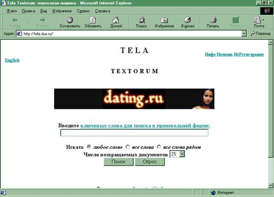 Поисковая система TELA, созданная петербургским Интернет-провайдером DUX, ориентирована на поиск русскоязычных страниц в WWW, а также англоязычных страниц на российских серверах.