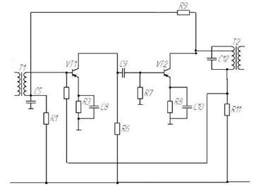 Каскад УНЧ выполнен по схеме с трансформаторным выходом. УНЧ представляет собой предоконечный каскад на VT5 (работает в режиме класса В) и оконечный однотактный – на VT6 (работает в режиме класса АВ). Связь между каскадами емкостная. Выбор заключается в том, что она создаёт меньшие частотные и нелинейные искажения, а так же имеет меньший вес и габариты конструкции.