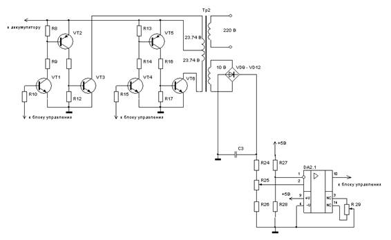 - выпрямитель – включает в себя понижающий трансформатор и зарядное устройство для аккумулятора, величина выходного напряжения на выходе блока +29В;