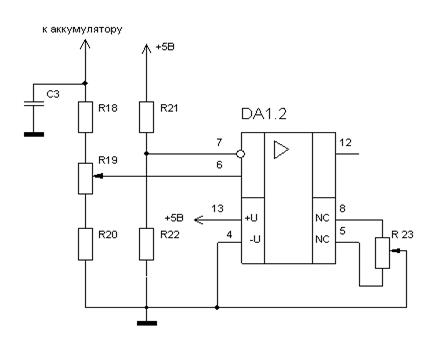 - компаратор 2 – выполняет сравнение уровня напряжения с выхода аккумулятора и фиксированного значения Uоп2, в случае, если напряжение на аккумуляторе меньше - вырабатывается управляющий сигнал, который соответствует режиму разряженного аккумулятора (напряжение аккумулятора меньше допустимого значения);
