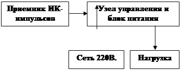 Так как при проектировании данного устройства подразумевается, что передатчиком ИК-импульсов будет являться пульт дистанционного управления от любого бытового прибора, который уже представляет собой готовое законченное устройство, то при проектировании схемы мы не будем учитывать схемотехнику передатчика, а обратим особое внимание лишь на приемную часть. В данном случае структурная схема разрабатываемого устройства будет иметь следующий вид (рис. 1).