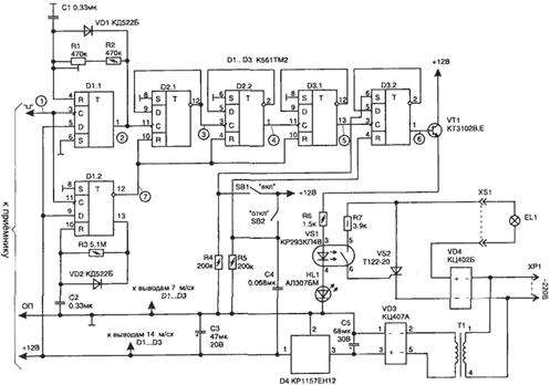 Индикатором срабатывания последнего триггера (D3.2) является свечение светодиода HL1. Оптронный ключ VS1 обеспечивает электрическую развязку блока управления от сети 220 В, что позволяет получить хорошую устойчивость схемы к помехам.