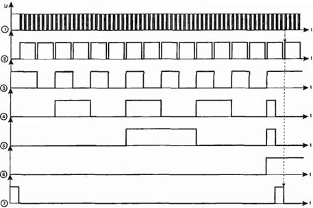 На рис.6 приведены диаграммы напряжений в контрольных точках, поясняющие работу блока управления. В начальный момент подачи питания на схему, цепь из элементов C4-R5 обеспечивает установку триггера в D3.2 в исходное состояние (лог. "0" на выходе 1). При нажатой кнопке на пульте ДУ из приходящих пачек импульсов на входы элементов D1.1 и D1.2 формируются более широкие. Триггер D1.2 через 2 сек. обеспечивает установку счетчиков D2, D3.1 в исходное состояние, т.е. формирует импульс обнуления на выходе D1 (вывод 12).