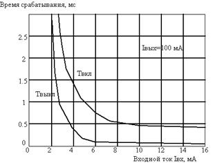Величина входного тока оказывает заметное влияние на динамические параметры твердотельного реле. Из приведенного рис.11 видно, что не следует работать на входном токе ниже номинального. В тоже время необходимо учитывать, что микросхемы серии КР293 сохраняют высокие показатели надежности, если средний входной ток не будет превышать 20 мА.
