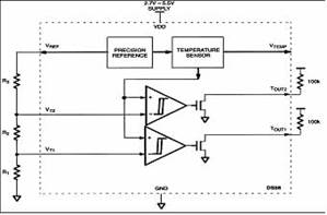 Потім я став аналізувати можливість придбання даних датчиків. Серед них мене спочатку дуже зацікавив DS56. Окрім того що він має безпосередньо вихід на якому змінюється напруга в залежності від температури, він має всередині 2 компаратори, напруга ввімкнення яких задається зовнішніми резисторами.