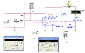 Далі приведена схема пристрою для моделювання без схеми під’єднання до АЦП. Як виявилось у пакеті моделювання Multisim 10 відсутня діюча модель реле, яка б була зручною для нас. Саме тому для моделювання було вирішено замість реле використовувати лампочку. Якщо лампа горить, то через неї тече струм і це означає що реле спрацювало і перемкнулось у інший стан. Це означає що напруга на (+) вході компаратора більша ніж напруга, яка поступає від датчика на (-) вхід компаратора Допоміжним засобом індикації буде амперметр у колі стоку транзистора.