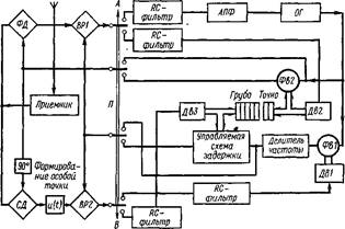 Фазовая автоподстройка опорного генератора сигналами ведущей станции производится следующим образом. Поиск передней части поверхностного сигнала предполагается уже выполненным. Поэтому в схеме должна осуществляться соответствующая коммутация переключателя П в такт приема сигналов береговых станций, а опорные кратковременные стробы временного различителя ВР1 на выходе ФД должны выделять лишь ту часть напряжения рассогласования, которая соответствует передней части поверхностных радиоимпульсов. Отстробированные напряжения передаются на блок фазовой автоподстройки АПФ опорного генератора. В результате фаза j0 опорного генератора изменяется до тех пор, пока не будет отличаться точно на 90° от фазы ВЧ заполнения радиоимпульса и постоянное напряжение на выходе ФД, обусловливаемое поверхностным радиоимпульсом, не станет равным нулю. Таким образом, фаза j» колебания на выходе опорного генератора будет хранить память о фазе ВЧ заполнения, поскольку j0 = jА + 90°. Фаза опорного напряжения СД при этом будет точно совпадать с фазой ВЧ заполнения поверхностного радиоимпульса ведущей станции.