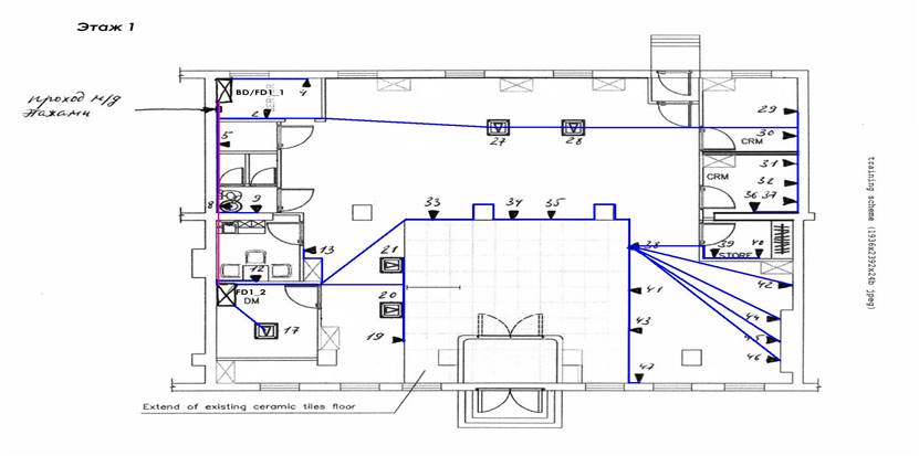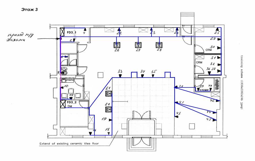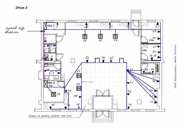 Длина магистрального кабеля = Сумма всех кабелей, приходящих с каждого этажа + 2 *3 м на этаж = 3* длина кабеля от каждого FD до прохода м/у этажами + типовая высота этажа *кол-во FD на 2 этаже + 2* типовая высота этажа *кол-во FD на 3 этаже + (кол-во FDи BD)*3м