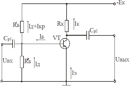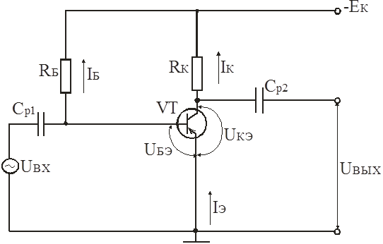 Простейшая схема резистивного усилительного каскада с общим эмиттером и питанием от одного источника показана на рис. 2. Входной сигнал поступает на базу и изменяет ее потенциал относительно заземленного эмиттера. Это приводит к изменению тока базы, а, следовательно, к изменению тока коллектора и напряжения на нагрузочном сопротивлении RK . Разделительный конденсатор Сp1служит для предотвращения протекания постоянной составляющей тока базы через источник входного сигнала. С помощью конденсатора Сp2на выход каскада подается переменная составляющая напряжения Uкэ изменяющаяся по закону входного сигнала, но значительно превышающая его по величине. Важную роль играет резистор RБ в цепи базы, обеспечивающий выбор исходной рабочей точки на характеристиках транзистора и определяющий режим работы каскада по постоянному току.