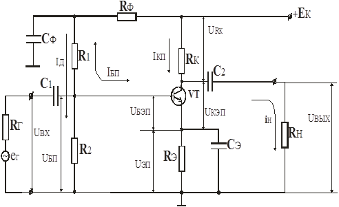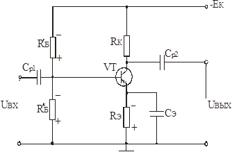 В большинстве случаев резистор RЭ шунтируется конденсатором CЭ достаточно большой емкости (порядка десятков микрофарад). Это делается для отвода переменной составляющей тока эмиттера от резистора RЭ .