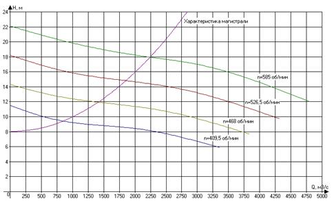 Используя полученную формулу, построим механическую характеристику насоса. Для этого находим по графику Q , H , η , соответствующие точке пересечения характеристики магистрали и характеристики насоса для одной из скоростей.