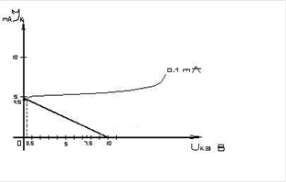 Данный метод заключается в построении на графике выходной характеристики транзистора рабочей прямой. Рабочая прямая проходит через точки Uкэ =Eк и Iк =Eк ÷Rн и пересекает графики выходных характеристик (токи базы). Для достижения наибольшей амплитуды при расчёте импульсного усилителя рабочая точка была выбрана ближе к наименьшему напряжению т.к у оконечного каскада импульс будет отрицательный. По графику выходных характеристик (рис.1) были найдены значения IКпост =4,5 мА, UКЭпост =0,5 В, а также IБпост . =0,1мА.