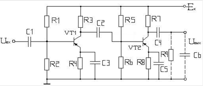 Данный усилитель должен содержать 2 каскада. Коэффициент усиления на каждом каскаде