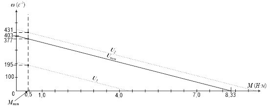 Из уравнений для ДПТ и воспользовавшись графиками характеристик можно рассчитать напряжение на выходе усилительно – преобразовательного устройства в зависимости от требуемой мощности; и мощность в зависимости от напряжения.