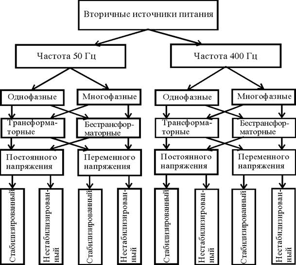 Первым шагом при диагностике и регулировке любой РЭС является проверка исправности блока питания. Для работы РЭС в основном используются вторичные источники питания (ВИП). Первичные источники питания - это сеть переменного тока, аккумуляторы, батареи, термо- и фотопреобразователи. Разновидности источников вторичного питания показана на рис. 1.