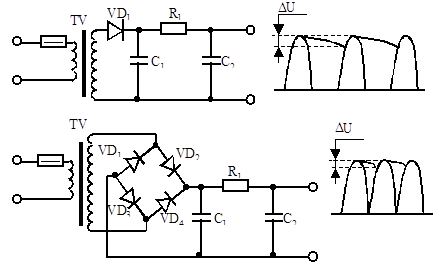Рис.2. Принципиальные схемы однополупериодного и двухполупериодного выпрямителей