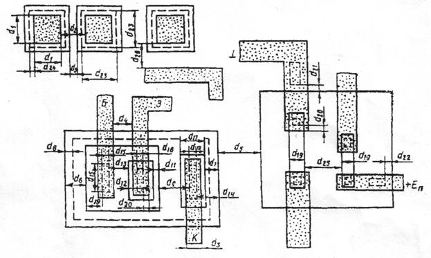 При разработке эскиза топологии микросхем площади изолированных областей делают как можно меньшими. Это позволяет, во-первых, реализовать на пластине большое количество микросхем и, во-вторых, уменьшить паразитные емкости переходов коллектор – подложка, влияющих на их параметры. Минимальная площадь изолированной области зависит от геометрических размеров размещаемых в ней элементов, а также расстояний, которые необходимо выдерживать между краем изолированной области и элементом и между элементами. В свою очередь, геометрические размеры областей самих элементов микросхем (эмиттера, коллектора, базы и т. д.) определяются требованиями, предъявляемыми к их электрическим характеристикам и параметрам, а также технологическими возможностями.
