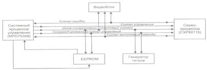 В данной схеме в обмене информацией по системной шине, которая состоит из комплекта токопроводящих линий, помимо микросхем системного процессора и сервопроцессора участвуют также блоки цифровой памяти (EEPROM), генератора титров и обработки видеосигнала.