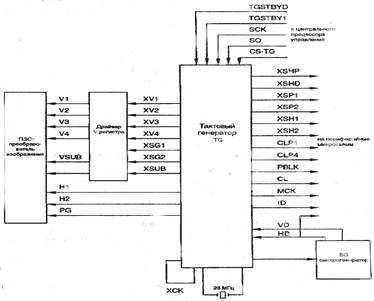 Тем не менее рассмотрение этих схем в подразделе, посвященном вопросам управления и контроля, необходимо, поскольку любые тактирующие генераторы можно называть управляющими. Кроме того, микросхема TG содержит цепи, непосредственно использующиеся в обработке сигналов изображения.