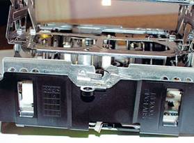 Проверяют элементы замка кассетоприемника 1 и 2 (рис. 5). Для устранения причины неисправности достаточно подогнуть деформированные элементы замка. Деформация элементов замка часто происходит из-за чересчур резкого закрытия кассетоприемника.