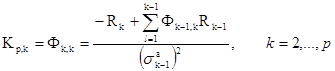 Используя соотношения (8а), (8б) и учитывая (7), алгоритм Левинсона-Дарбина, позволяющий вычислять коэффициенты АР по коэффициентам отражения, можно представить в виде