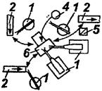 Примечание. На схемах обозначено: 1 - ПР; 2 - конвейер; 3 - основное технологическое оборудование; 4 - магазин с заготовками, деталями или инструментом; 5 - вспомогательные устройства, расширяющие функции робота (устройства контроля, измерения и т.п.); 6 - вспомогательные устройства ориентации или фиксации деталей.
