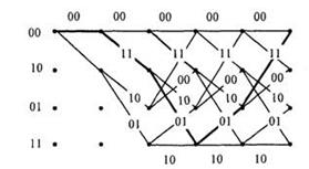 Кодові грати цього коду показані на мал. 1.1. При його складанні враховано, що кодер містить пам'ять у вигляді дворозрядного регістра. Кожному з чотирьох можливих станів цього регістра відповідає один з чотирьох вузлів решітки. Тому лівий символ в позначенні вузла дорівнює останньому інформаційному біту, вже записаному в регістр. При записі в регістр чергового інформаційного символу регістр міняє стан на одне з двох сусідніх. Цей перехід позначений ребрами грат. Порядок вузлів вибраний таким, що при нульовому поточному інформаційному символі (а=0) перехід в наступний стан відповідає верхньому ребру, а при