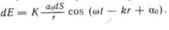 Амплитуда сферической волны убывает с расстоянием r от источника по закону 1/r . Следовательно, от каждого участка dS волновой поверхности в точку Р, лежащую перед этой поверхностью, приходит колебание: