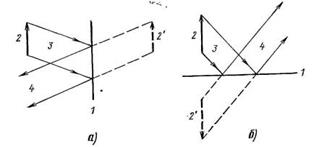 Рис. 1.14. Формирование прямого (а) и перевернутого (б) изображений плоским зеркалом: 1 – зеркало; 2 и 2' – предмет и его мнимое изображение; 3 – лучи от предмета; 4 – направление наблюдения