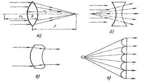 Линзы (рис. 1.17) несомненно относятся к числу основных элементов большинства оптических систем; конструктивно они представляют собой однородный – прозрачный материал, ограниченный двумя полированными преломляющими поверхностями, из которых хотя бы одна – неплоская (обычно сферическая). Наиболее распространены тонкие двояковыпуклые сферические линзы, хотя известно и много других их разновидностей. Рассмотрение хода лучей в различных линзах показывает, что они могут служить для преобразования параллельного пучка лучей в сходящийся (собирающая линза), в расходящийся (рассеивающая) или в параллельный пучок другого сечения (телескопическая). Во всех случаях назначение линзы – формирование оптического изображения с одновременным его увеличением (уменьшением). В зависимости от конструкции линзы и места расположения предмета могут формироваться как действительные, так и мнимые изображения. Все разнообразие свойств линз делает их удобными для создания оптических систем различного функционального назначения.