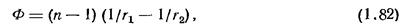 где r1 и r2 – радиусы кривизны передней (относительно падающих на нее лучей) и задней поверхностей. Правило знаков при определении r1 , r2 таково, что в двояковыпуклой линзе r1 положительно, а r2 отрицательно; поэтому для такой линзы при |r1 | = | r2 | = r