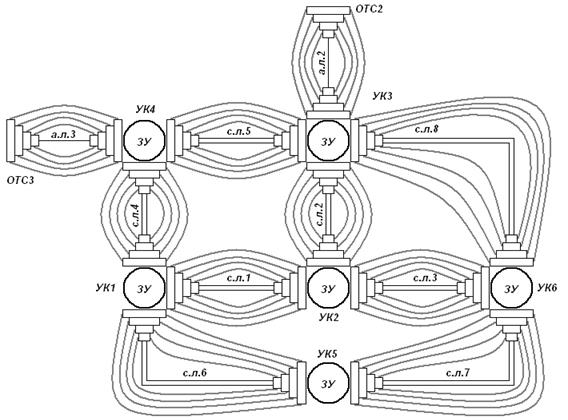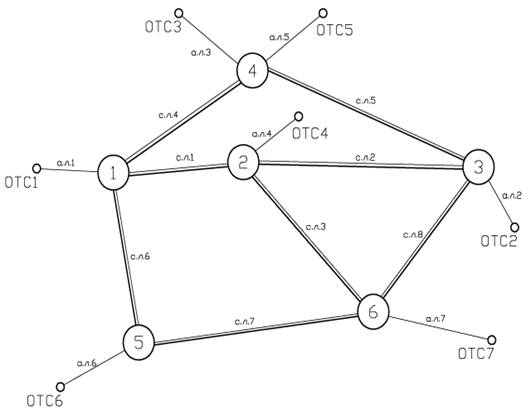 В качестве условия задаётся сеть, изображённая на рисунке 1. На ней представлены узлы коммутации (УК) и оконечные транспортные станции (ОТС), соединённые между собой абонентскими (а.л.) и соединительными (с.л.) линиями. Кроме того задаётся способ коммутации и некий признак для выбирания маршрутов между заданными оконечными транспортными станциями по варианту для каждого студента индивидуально.